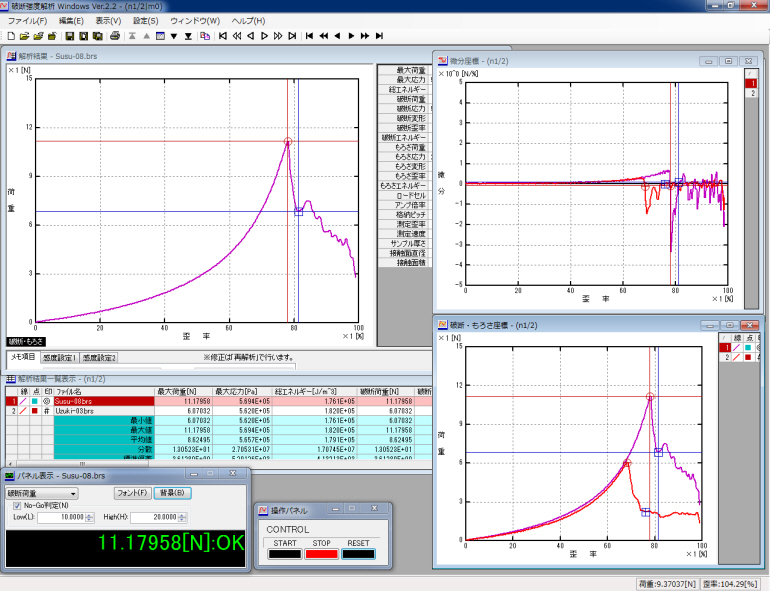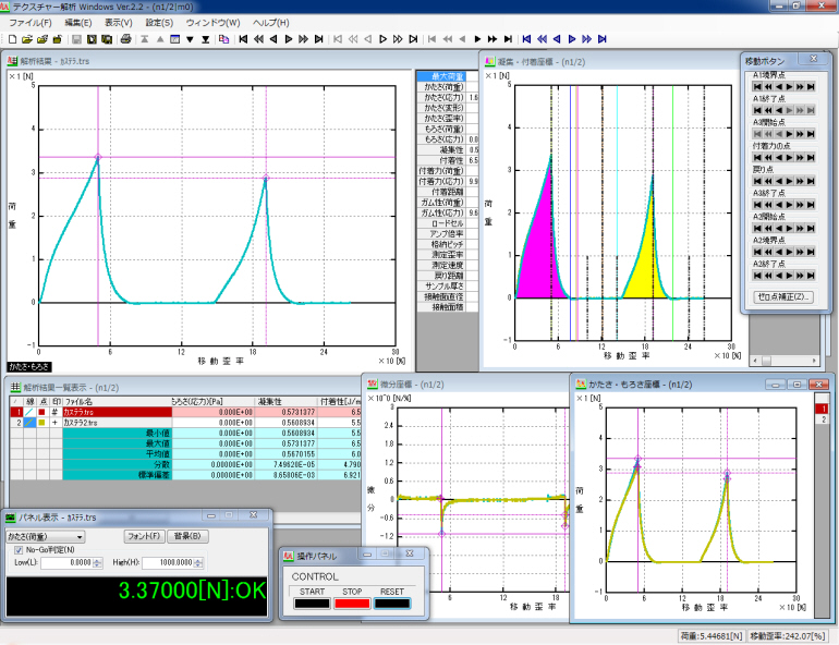 | ・ | 解析結果表示、重書座標表示、解析結果一覧表示、パネル表示、微分座標表示(テクスチャー・破断強度)、計算波形座標(クリープ)、フォークトモデル表示(クリープ)、色塗座標(テクスチャー)などの表示画面があります。 |