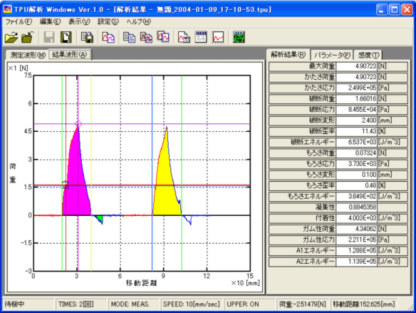 最大荷重・かたさ荷重(応力)・もろさ荷重(応力)・凝集性・付着性・ガム性荷重(応力)などの各項目で解析します。